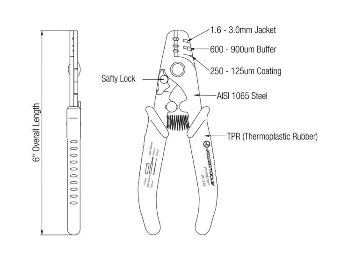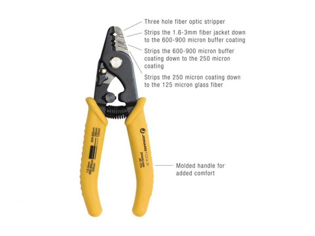 Het eerste gat van deze Fiber Optic Stripper stript de 1,6-3 mm vezelmantel tot aan de 600-900 micron buffercoating. Het tweede gat stript de 600-900 micron buffercoating tot aan de 250 micron coating en het derde gat wordt gebruikt om de 250 micron kabel tot aan de 125 micron glasvezel te strippen zonder deuken of krassen.