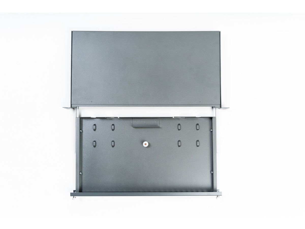 Het 19 inch paneel (1HE) is uitgevoerd in gepoedercoat plaatstaal in de kleur grafiet.